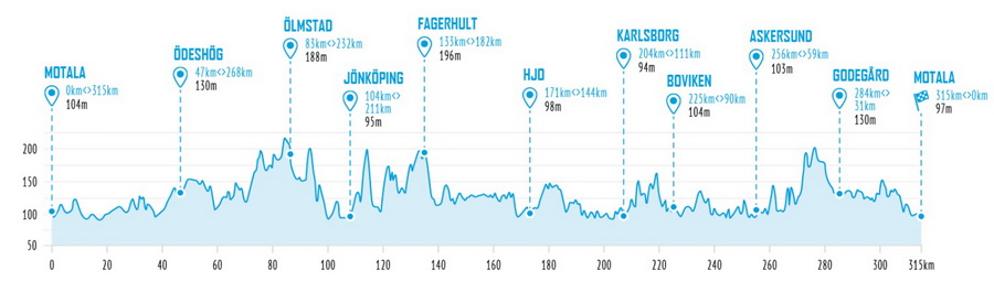 Sur le parcours il y a 9 dépôts qui servent des boissons chaudes et froides, des bananes, des petits pains, etc à Ödeshög 47 kilometer, Ölmstad 83 kilometer, Jönköping 104 kilometer, Fagerhult 138 kilometer, Hjo 177 kilometer, Karlsborg 207 kilometer, Boviken 230 kilometer, Hammarsundet 260 kilometer, Medevi 277 kilometer. Trois repas copieux sont servis: à Jönköping km104, Hjo km171 et à l'arrivée à Motala km315, où je suis passé le 14 juillet 2016 quand j'entamais ma 2ème conquête du Nordkapp à vélo à traction animale.