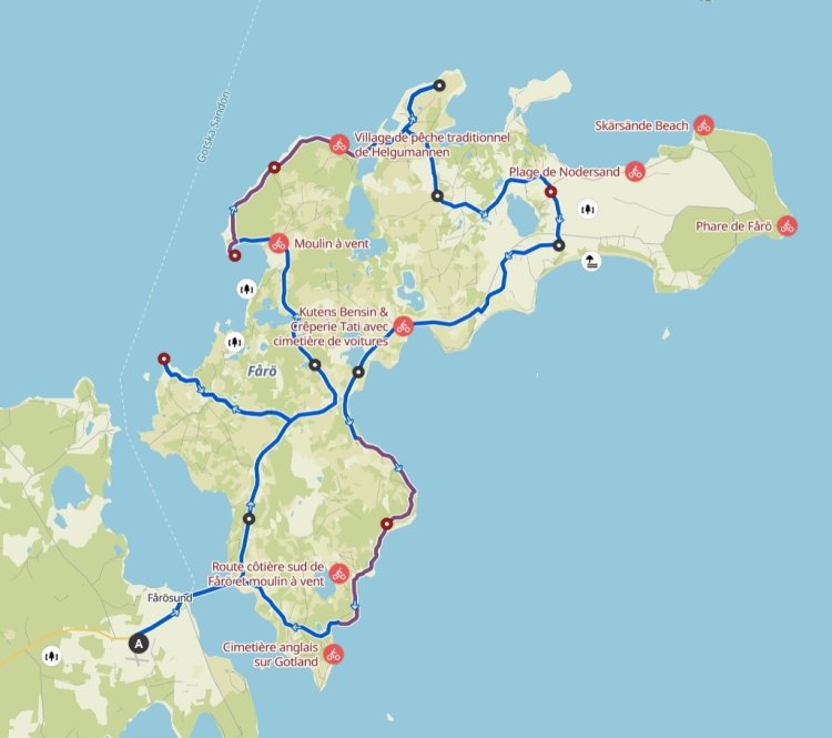 A Fårösund, au finistère nord de Gotland, le flygande cyklisten, le cycliste volant que je suis, et qui appartient, mentalement, physiquement mais pas culturellement du fait de ma naissance au resande folket, aux gens du voyage, reprend aujourd'hui sa translation qui le porte et le transporte après ses premiers 2712 kilomètres de ce nouveau voyage gutnique 2025.