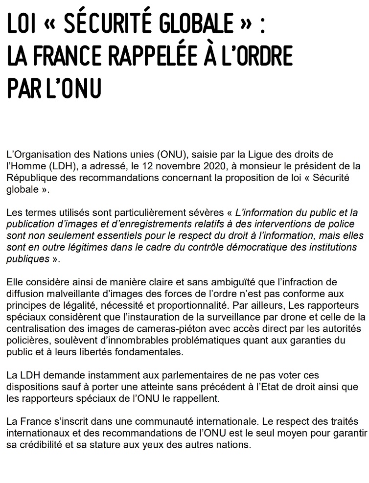 Au Conseil Européen du 10-11 décembre 2020 les dirigeants de l'UE se réuniront à Bruxelles pour débattre de la poursuite des mesures de coordination liées au Covid-19. Le 12 novembre 2020 le Haut-Commissariat aux Droits de l’Homme de l'ONU a sévèrement rappelé à la Loi le président français Macron: "L’information du public et la publication d’images et d’enregistrements relatifs à des interventions de police sont non seulement essentiels pour le respect du droit à l’information, mais elles sont en outre légitimes dans le cadre du contrôle démocratique des institutions publiques ". En réponse à l'ONU, comme pour toutes les fois précédentes, le gouvernement français ne tombe pas dans le déni et les vociférations comme en Hongrie et en Pologne, le gouvernement français s'en fout et avec élégance ne fait même pas état de ce très grave rappel à la Loi du Haut-Commissariat aux Droits de l'Homme de l'ONU. La France s'offre avec élégance la quotidienneté du fascisme, et les rares petites manifestations contre la Loi Sécurité Globale sont immédiatement réprimées pour dévier l'attention sur des violences dans la rue au lieu de la focaliser sur la violation de l’État de Droit commise par le gouvernement français. Et les habitants de France ne s'en aperçoivent pas ou minimisent à outrance comme à leur habitude.